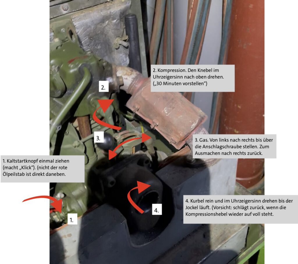 Es braucht 4 Schritte, um den Jockel zu starten (siehe Bild).